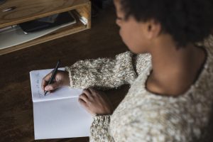 Young woman at desk writing in notebook